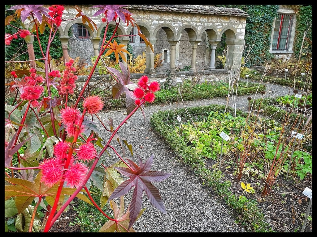 We turned a corner and were in the hall along the central square which was lined with ancient decorative panels and several of the massive church bells. Interpretive signage with QR codes for translation to English gave the history of the place. CT kept turning corners and opening doors and suddenly we were in the old chapel, still in use today, boasting beautiful artwork and architecture with columns and stained glass and decorative panels and the reconstruction of the grave of Eberhard VI. von Nellenburg who was a brother at this monastery in 1072 after a trip, or two, to Rome.
