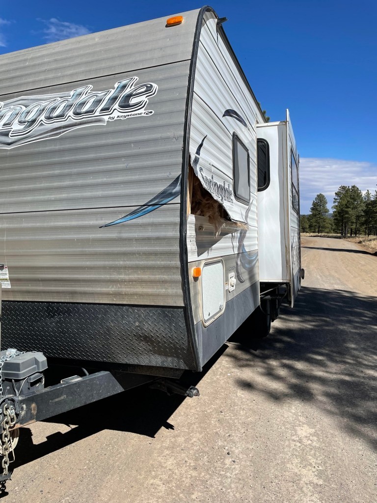 At the next forest road turn off we pulled to discover that the branch’s push into our side had loosened screws along the side panel. The speed down the asphalt and the 40 mph winds for the past few hours since leaving the Grand Staircase had wrenched the panel open excreting our insulation into the highway behind us. Thankfully with an array of tools always carried, a few random screws, some hemming and hawing, and several swear words later, the rig was “restored” and back to drivable mode.
